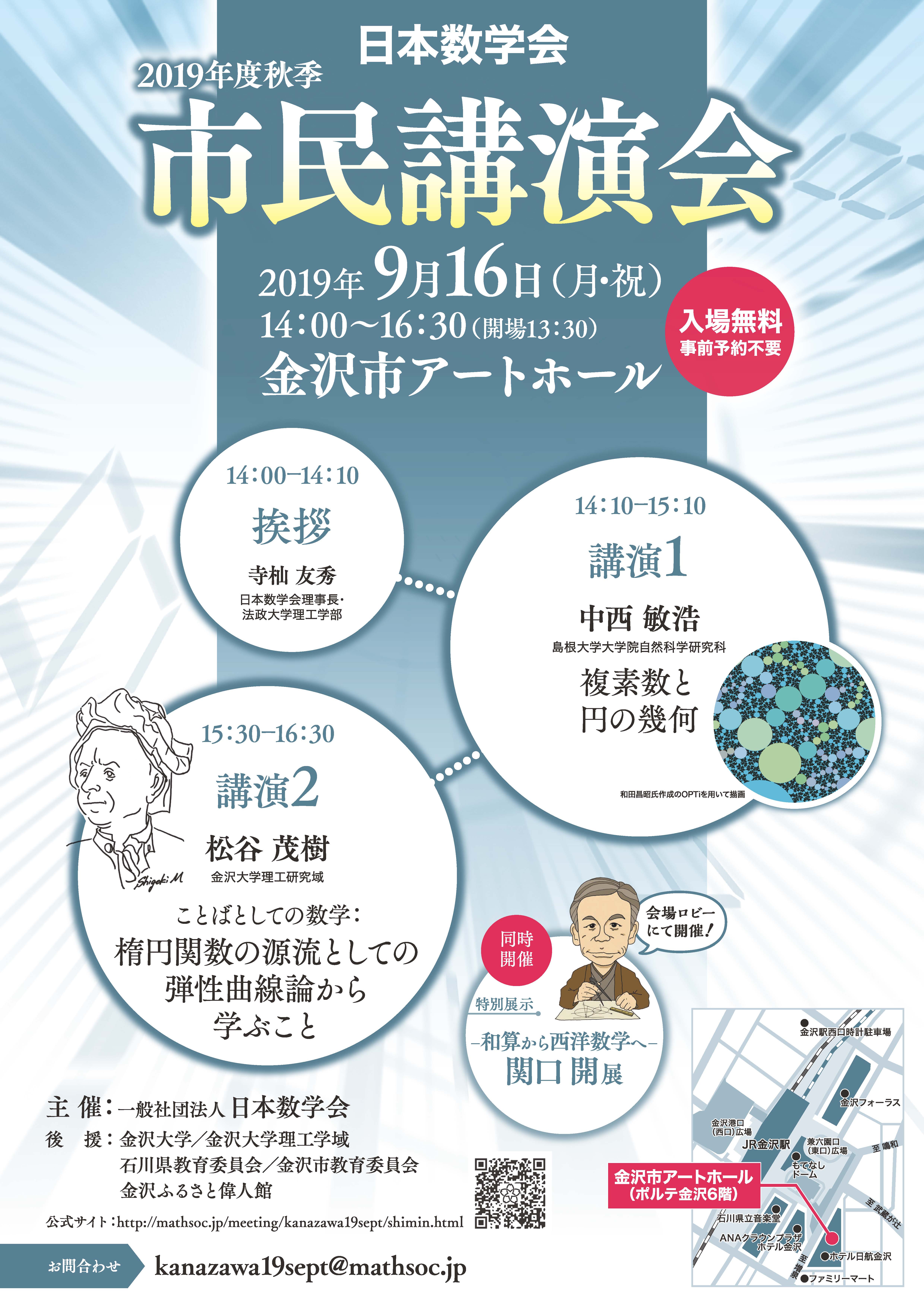 14:00--14:10 挨拶 寺杣友秀(日本数学会理事長・法政大学理工学部) 14:10--15:10 講演1 中西敏浩(島根大学大学院自然科学研究科) 「複素数と円の幾何」 講演概要 高校の学習指導要領の変遷で消えたり復活したりを繰り返している複素数(現在は復活期)について話をします.複素数と円とは密接な関係にあります.例えば,複素変数の一次式の比で表される変換(メビウス変換)は円を円に対応させますし,複素微分可能な関数は「無限小円」を「無限小円」に写します.本講演では,「円」が取り持つ複素数や複素数の関数とさまざまな幾何(非ユークリッド幾何やフラクタル幾何など)との関係を,講演の地・金沢とも縁があるクライン群の理論やリーマン面の変形理論も交えて紹介したいと思います. 15:30--16:30 講演2 松谷茂樹(金沢大学理工研究域) 「ことばとしての数学:楕円関数の源流としての弾性曲線論から学ぶこと」 講演概要 数学には,有用性から遠くあるほど崇高であるものとして,人類の未踏の知を極めるという側面があります.それに対して,楕円関数論を完成させたワィエルシュトラスの弟子であった哲学者フッサールは,幾何学の起源を「幾何学は測量技術者の言葉を極限操作したものである」としました.あまり知られていないことですが,現代数学全般に影響を与えている楕円関数や楕円曲線の起源も,建築物の梁の形状を記述するためにベルヌーイやオイラーらが行った弾性曲線の研究でした.講演では彼らが数学をどのように発展させ,利用したかを概観します.楕円関数の萌芽に,言葉としての数学の在り方を探り,歴史に学ぶことで指針を提示し,その指針に沿った数学の応用を具体例と共に紹介します.数学はすでに現代技術において重要な位置を占め,これからも大きな役割を担うことが約束されています.これらの視点から言葉としての数学の在り方を示したいと思います.