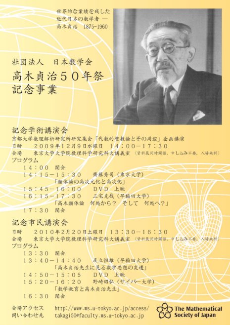 - 2010年度秋季総合分科会(名古屋大学)の市民講演会の会場(2010年9月26日(日)14:00-16:30、名古屋大学野依記念学術交流会館)で高木貞治50年記念のポスター展示を行います