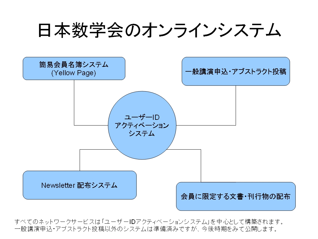 にアカウントを設定します。これにより、日本数学会が会員に提供するネットワークサービスのセキュリティーが確立されます。 - 今後、これを基盤として、「一般講演申込・アブストラクト投稿システム」の他に、様々なネットワークサービスを提供していきます。