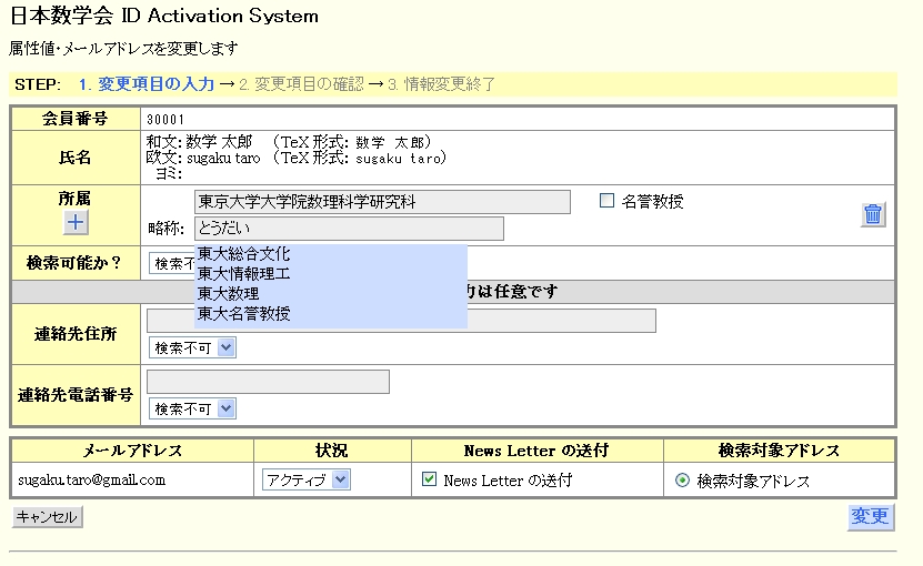 通常の場合、会員名簿のデータにある所属がすでに記載されています。必要ならば変更をお願いします。