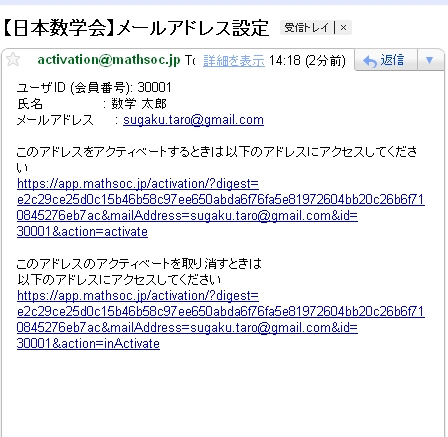 以下の形式の確認メールが activation(at)mathsoc.jp から届きます。 そこにあるURL にアクセスして、Activation を続けて下さい。