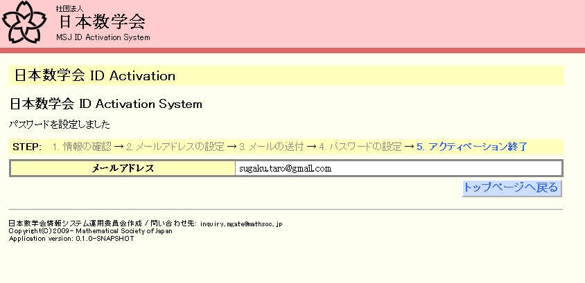 さらなる設定をするときは、「トップページへ戻る」をクリックして、ログインします。 この段階で、IDである電子メールアドレスとパスワードでのみログインが可能となっています。 (IDである電子メールアドレスとパスワードを設定した段階で、会員番号とActivation によるログインはできないようになっています。)