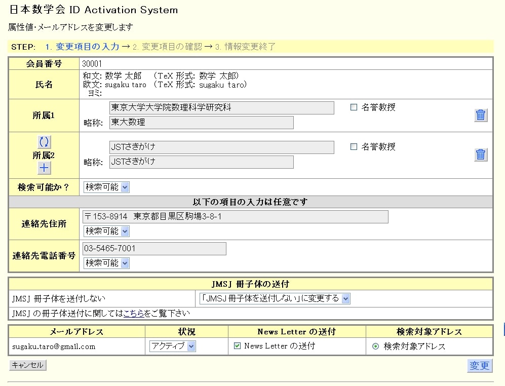 へのリンクがあります.そのリンク先にログインをして下さい.(もしアカウントの作成(activation)が未だの場合は,「数学通信」6月号で送付しました会員証にあるActivation Keyを用いてアカウントを作成してください.)ログイン後,「詳細情報表示」のボタンからさらに「属性値・メールアドレス変更」のボタンを押すと下図の画面が現れます。