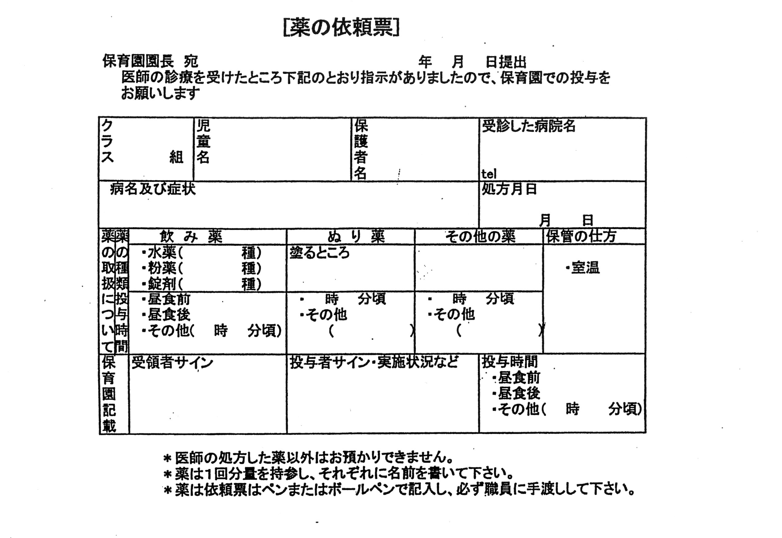 投薬が必要なお子さんは保育士が投薬できる場合があります. 投薬に関する説明書を良く お読みの上 投薬の依頼書をお持ちください.
