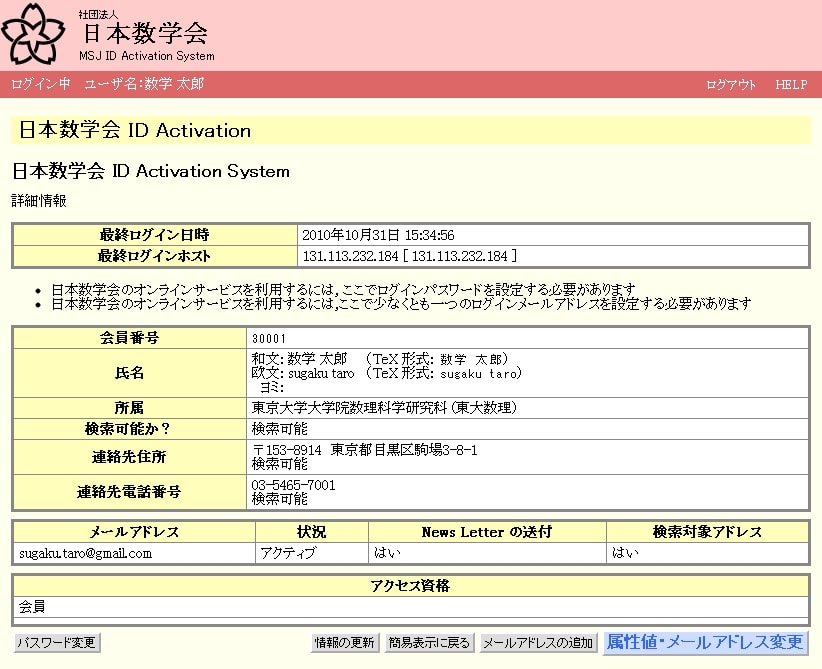 現状の設定値の詳細が表示されます。データの変更を行うときは、「属性値・メールアドレス変更」をクリックします。
