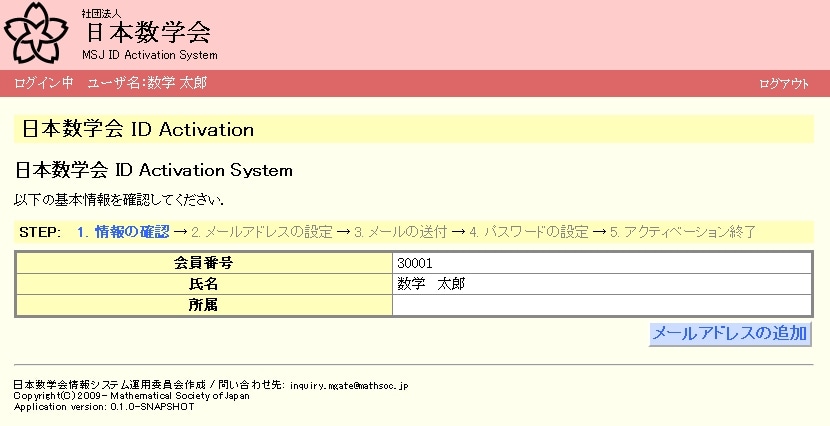 会員番号と氏名、所属の基本情報を確認して下さい。氏名の修正は、事務局に依頼して下さい。所属の修正はご自分でお願いします。