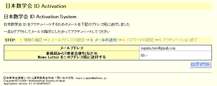 以下の形式の確認メールが activation(at)mathsoc.jp から届きます。 そこにあるURL にアクセスして、Activation を続けて下さい。