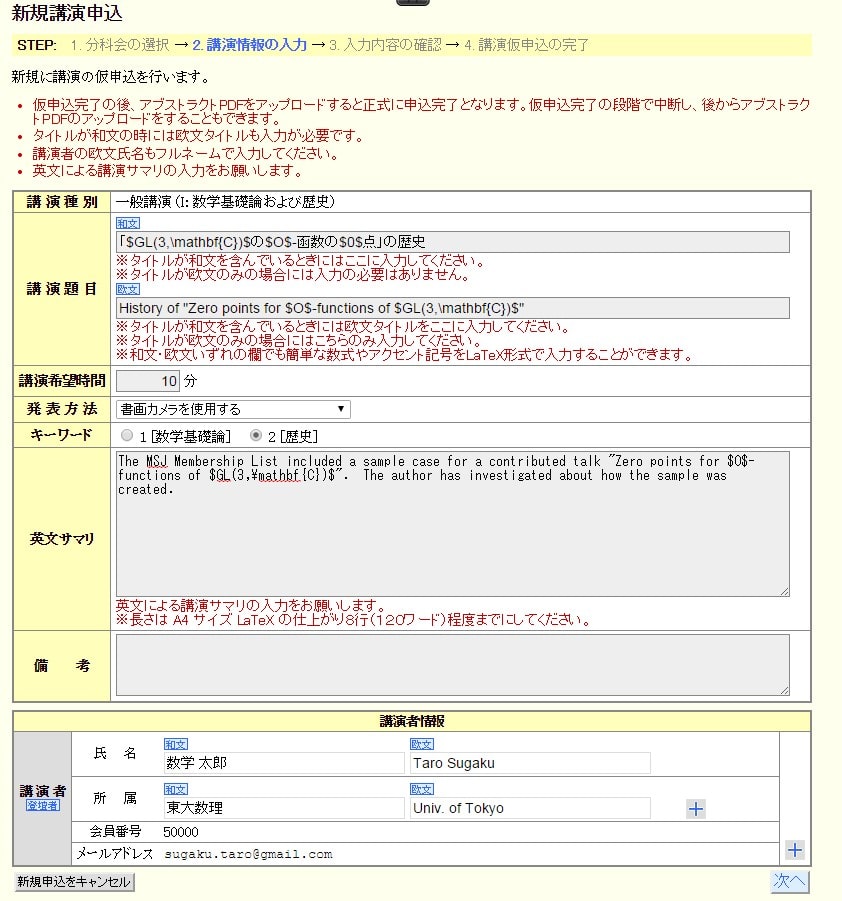 数学基礎論および歴史、函数論分科会、実函数論、統計数学、応用数学の分科会での講演申し込みの場合は、キーワード(分類コード)をキーワード欄に入力しないとエラーが出ます。 各分科会の分類コードについては、2013年度年会の場合、開催情報のページからリンクされている「分科会が定めるキーワード・分類コード一覧」 を参照して下さい。