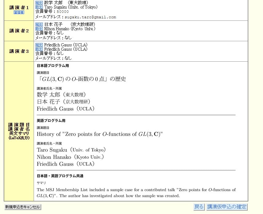 講演仮申し込みの確定をクリックすると申し込みが確定します。申し込み期間中であれば、後で修正も可能ですしキャンセルも可能です。
