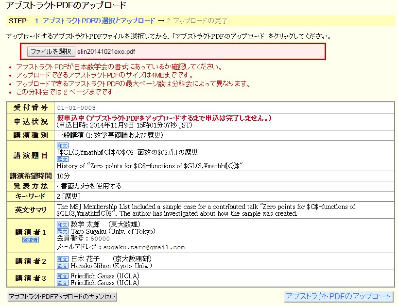 画面の右下にある アブストラクトPDFをアップロードクリックして選択したファイルをアップロードします。