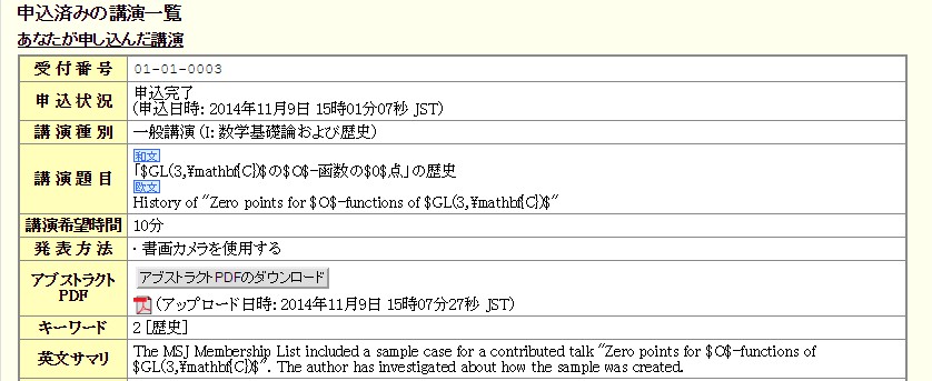 画面の下にある申し込み内容の変更のボタンをクリックすると、講演題目の修正など申し込み内容を変更できます。また、アブストラクトPDFの再アップロードのボタンをクリックすると、アブストラクトPDFを差し替えることができます。