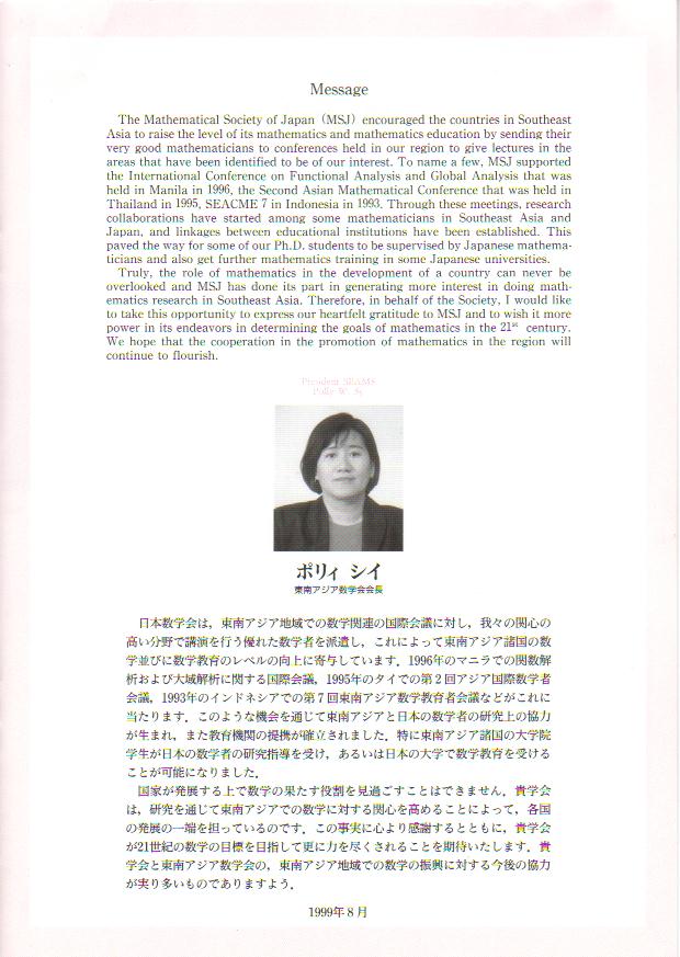 - ◇東南アジア数学会会長からのメッセージ(学会パンフレットから)